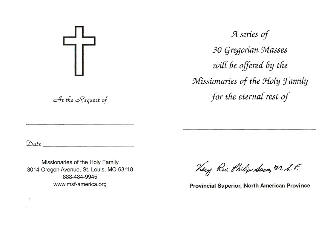 By Mail (online is our fastest option): Please print the Mass Intention Request Form. Then mail the completed form, along with your Mass Offering (see form for details), to the Missionaries of the Holy Family, 3014 Oregon Avenue, Saint Louis, Missouri 63118-1412.