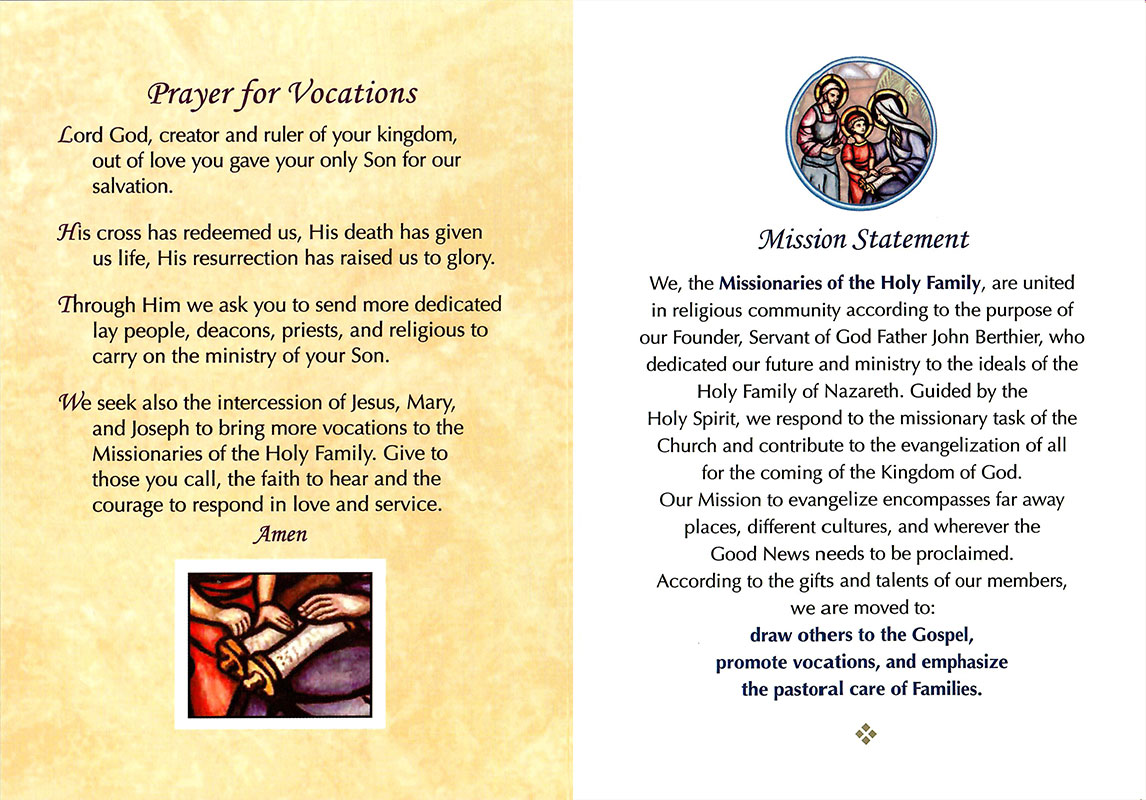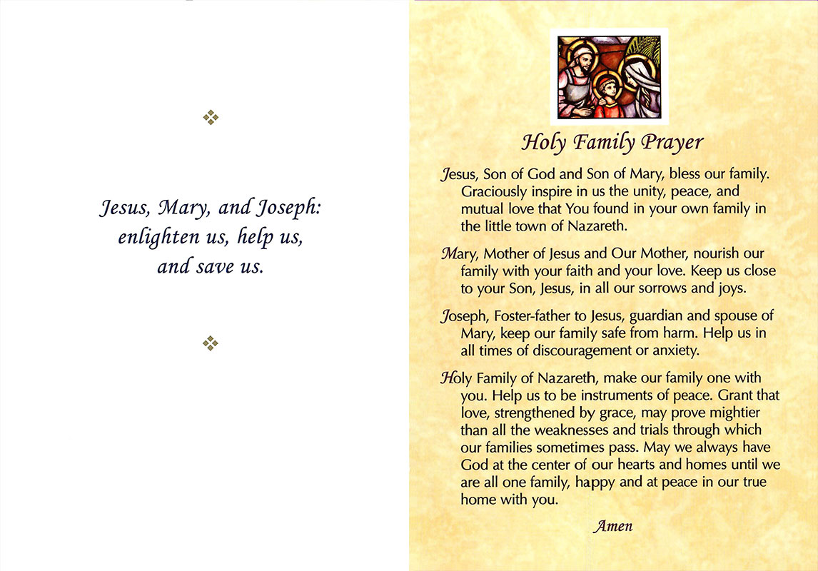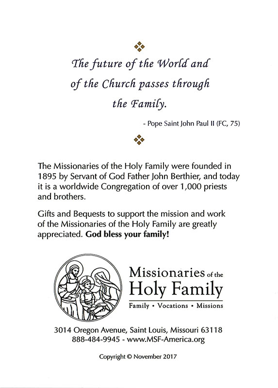 With an enrollment, you receive our lovely, 8-page, Perpetual Mass Association Enrollment Card with the enrollee’s name and the requester's name handwritten in the card. Each card includes the signature of a Holy Family Priest, usually the Provincial Superior. The Mass Card is mailed to you, or we are happy to send it directly to another person on your behalf. We can also add personalized messages.