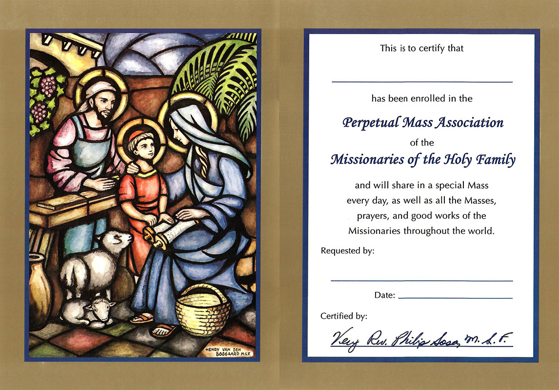 By Mail: Please print the Perpetual Mass Association Enrollment Form. Mail the completed form along with your donation to the Missionaries of the Holy Family, 3014 Oregon Avenue, Saint Louis, Missouri 63118.